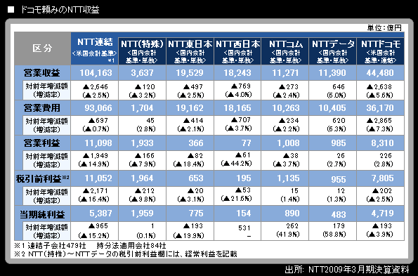 「100年に1度」と言われる不況の影響が、全くなかったわけではない。加えて、固定電話契約者の減少などによる通信料収入減というマイナス要因も継続したが、傘下のNTTドコモがいつものように利益の大半を稼ぎ出し、その結果いつものように1兆円を超える営業利益を記録した。