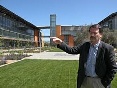 ブドウ栽培・醸造学科の研究施設「ロバート・モンダビ・インスティ テュート」中庭で語るブルトン教授