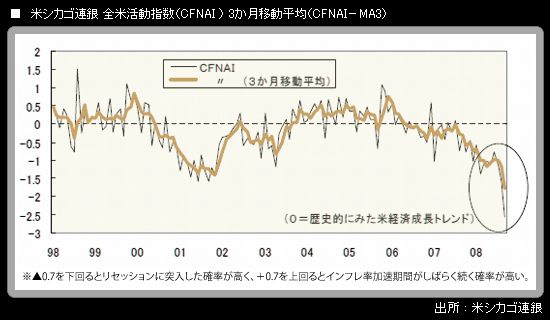 シカゴ連銀が景気判断を下す上で重視している3カ月移動平均ベース(CFNAI-MA3)も急低下し、▲1.78になった(前月比▲0.60ポイント)。シカゴ連銀は、「リセッションが始まった可能性が増大していることを10カ月連続で示すものだ」とコメントしている。
