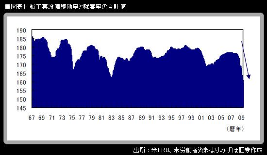 興味深いことに、直近2009年5月の数字は、数字を計算することができる1967年以降で最低の数字である。鉱工業設備稼働率は68.3%、就業率は90.6%(失業率は9.4%)で、合計値は158.9。82年12月、および前月(2009年4月)に記録した160.1を下回った。需給ギャップからくる米国経済へのデフレ圧力はどうやら、過去最大のものになりつつある。