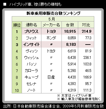 一方、最大の恩恵を受けているのは、減税開始直後という絶好のタイミングでハイブリッド車(HV)「プリウス」の新モデルを投入したトヨタ自動車だ。両税の全額免除が追い風になり、2009年5月18日の発売からわずか2週間で受注台数は13万台を突破した。これは、1~5月の外国メーカー車の総販売台数の2倍を超える水準となる。