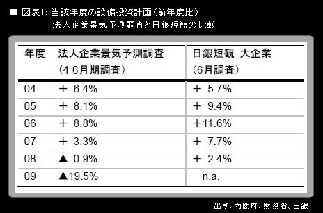 22日に内閣府・財務省から発表された4-6月期の法人企業景気予測調査で、2009年度設備投資計画は前年度比▲19.5%という、非常に大きなマイナスの数字になった。日銀短観で大企業の2009年度設備投資計画が記録的な落ち込みになる可能性が高まった(弊社予想:前年度比▲13.0%)。しかも、リスクは左記予想からさらに下振れる方向にある。