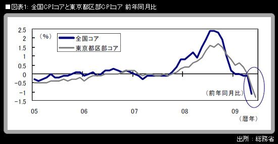 6月26日に総務省から発表された5月の全国消費者物価指数は、生鮮食品を除く総合(CPIコア)が前年同月比▲1.1%となり、前月の同▲0.1%からマイナス幅を急拡大。2001年5月に記録した前年同月比▲1.0%を下回り、過去最大の下落率を更新した。また、食料(酒類を除く)及びエネルギーを除く総合、いわゆる欧米型CPIコアは前年同月比▲0.5%で、前月の同▲0.4%からマイナス幅を小幅拡大した。日本経済の大きな特徴である「デフレ」が、一段と強まっている。