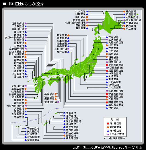 全国には多くの地方空港がある。2009年6月開港した静岡空港を含め、その数は98に上る。日航の経営が傾くような事態になれば、国内の航空ネットワークをこれまで同様の形で維持することはできない。地方空港を抱える地域の経済をはじめ、国民生活に多大な影響を与える懸念がある。