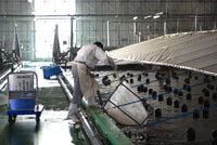 薬品を使わずにエビを育てるためには、他にも、様々な仕組みがある。そもそも、屋内型養殖としているのは、渡り鳥の飛来や、飛散農薬による水の汚染リスクを低減するため。養殖場内に入るには、土足から場内専用の長靴に履き替え、手はアルコールで消毒し、雑菌が水槽に入らないように配慮している。