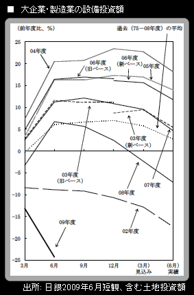 例えば、2009年6月の日銀短観には「設備投資額(含む土地投資額)の足取り」というグラフが付いており、設備投資計画の年間変更パターンが見られる。
