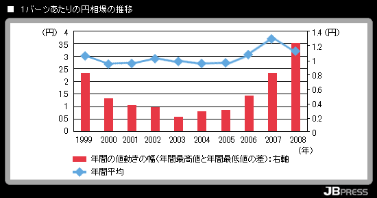 では、数字上でタイはどう評価できるか。バーツの為替推移を見ると、ここ数年で円に対するバーツの価値が高くなっていたことが分かる(下の図)。その一方で、1年間におけるバーツの値動きの幅も大きくなっている。昨年度は暴動によってバーツが大きく下落したが、その前から値動きの幅は大きくなっていた。