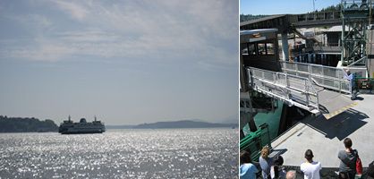 シアトル市街から、観光名物として知られるワシントン州営フェリーに乗船。ピューゲット湾の眺望を十分に楽しむ間もなく、30分ほどでベインブリッジ島に到着する。