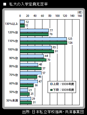 日本私立学校振興・共済事業団によると、2009年5月1日時点で集計した570校のうち、文科省定員充足率が100%未満の大学は全体の半数近い265校。このうち、補助金が打ち切られる充足率50%未満の大学が31校ある。短大(356校)はもっと悲惨で、定員割れは約7割の246校、うち50%未満が27校に上る。