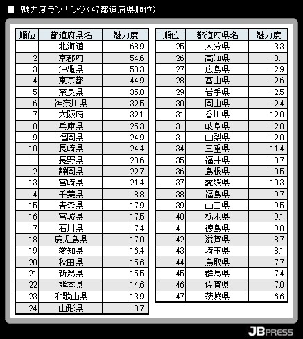 全国の都道府県の中で最も魅力的なのは北海道。2位は京都府、3位は沖縄県と続き、東京都は4位、奈良県が5位となった。一方、最も魅力度が低いのは茨城県。ついで佐賀県、群馬県が低い──。