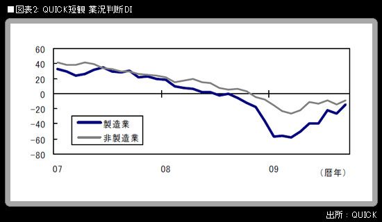 業況判断DIは、製造業が▲14(前月比+12ポイント、6月調査比+25ポイント)、非製造業が▲9(前月比+5ポイント、6月調査比+4ポイント)になった。