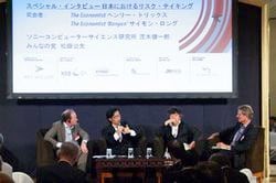 左からヘンリー・トリックス氏、松田公太氏、茂木健一郎氏、サイモン・ロング氏 (撮影:前田せいめい、以下同)第1回は、『日本におけるリスク・テイキング』と題されたスペシャルインタビュー。脳科学者でソニーコンピューターサイエンス研究所上級研究員の茂木健一郎氏と、みんなの党参議院議員の松田公太氏に、リスクに対する日本人の態度、日本社会の特性を聞いた。