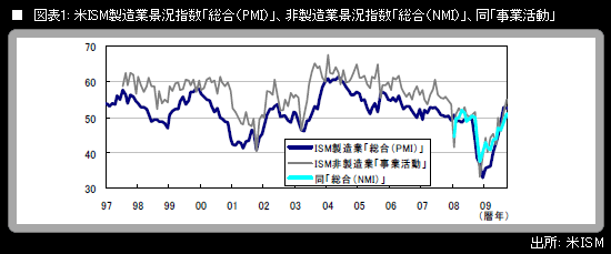 株価が久々に上昇する材料になったのは、(1)米9月のISM非製造業景況指数が50.9(前月比+2.5ポイント)となり、「リーマン・ショック」の直前である2008年8月以来となる50台回復を果たしたこと、および(2)米大手投資銀行のアナリストが米銀株の投資判断を引き上げたことである。(1)については、市場予想中心が50.0前後になっていたよりも高い数字になったことが好感された。