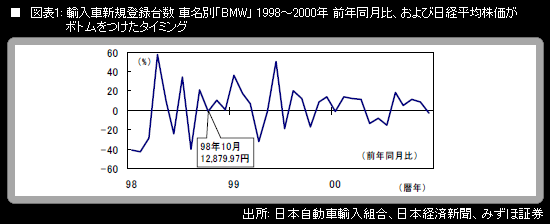 図表1のケース(1998年10月に1万2879.97円でボトムをつけた日経平均株価は、ITバブルの波に乗って、2000年4月に2万833.21円でピークを記録)では、「BMW」新規登録台数は、月ごとの振れが大きいものの、前年同月比+10%超を記録する月がかなり多かった。株高による資産効果が、比較的素直に出ていたと言えるだろう。