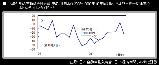 日本自動車輸入組合が毎月発表している輸入車新規登録台数のうち、車名別内訳「BMW」を、消費動向のインディケーターとして、筆者は以前から注目している。値が張る耐久消費財であることから、もっぱら高額所得者層の消費動向を探るツールとなる。ここでは、今年3月を含む過去4回の日経平均株価底打ちの後の局面における「BMW」新規登録台数の前年同月比を、グラフにしてみた(図表1~3;日経平均株価は終値ベース)。
