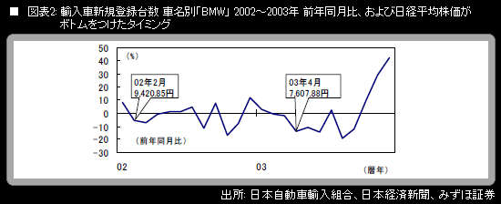 図表2のケース(2002年2月に9420.85円でボトムをつけた日経平均株価は、同年5月に1万1979.85円でピークを記録。そこから急落して2003年4月に7607.88円でボトムをつけ直した日経平均株価は、息の長い上昇局面入りし、2007年7月に1万8261.98円でピークを記録)では、「BMW」新規登録台数は、2002年前半の株高局面では目立った回復を示すことなく、同年後半には再度悪化。その後、2003年4月に株価が再度ボトムをつけた後は、同年10月以降、目覚ましい増加ぶりとなった。