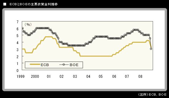 1.5%という利下げ幅は、1997年にBOEの政府からの独立性が確保されて以降では最大となる。また、年3.0%という政策金利水準は1955年以来の低水準である。さらに、ユーロ発足以降で、英国の政策金利がユーロ圏のそれを下回ったのは、初めてのことである。英国の利下げも10月8日の0.5%協調利下げに続くもので、住宅バブルおよび信用バブル崩壊の悪影響が加わった景気状況の深刻さに鑑みると、一段の利下げが今後避けられない。BOEの利下げ声明文は、物価状況について、「ここ数週間で、インフレリスクはダウンサイドへと決定的にシフトした」と述べており、景気刺激・信用収縮対応としてのアグレッシブな利下げ路線を妨げるものはない。