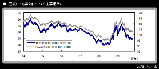 対主要通貨ベースのドル実効レートは、2008年5月に70を下回る水準まで下げており、これが過去最低水準。その後、同年9月の「リーマン・ショック」を経て、リスク回避志向の強まりを背景とするドルへの投資資金回帰(リパトリ)が加速し、今年3月には86を超える水準までリバウンドした。そこで米国株がボトムをつけて反発局面に。株価の上昇とともにリスクテイクの動きが徐々に復活し、逃避通貨になっていた米ドルからその他の通貨へと資金が再度流出していった。さらに、米国の超低金利政策が長期化するだろうという見方が浸透する中で、ドルと円のLIBOR3カ月物の水準逆転や、円高容認とも受け取れる藤井裕久財務相の発言なども材料視されて、対円も含めてドル安がさらに進みやすくなったというのが、ドル実効レートの上下動に対する大まかな説明になる。