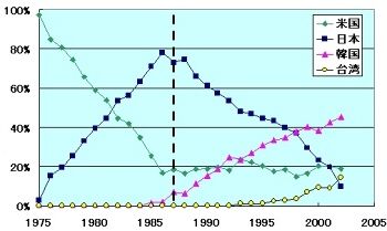 図2は、国籍別DRAMのシェアの推移である。特許出願数と同じく、日本のシェアは87年にピークがあり、その後、低下していく。特許出願数とDRAMシェアの傾向が、非常によく似ていることに驚く。