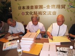 自著にサインする(左から)森田拳次氏、石川好氏、ちばてつや氏