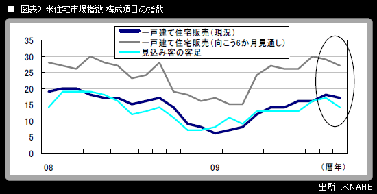 HMIの低下は今年6月以来4カ月ぶりのことだが、問題は総合指数を算出するのに用いられる構成項目の指数3つ、「一戸建て住宅販売(現況)」「一戸建て住宅販売(向こう6カ月見通し)」「見込み客の客足」の動きである。今回は、3つすべてが低下した。これは昨年11月以来の出来事である。