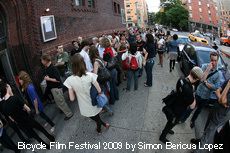 アンソロジー前で上映を待つ観客の列 イベントの中核となるのは、世界各地で製作された自転車にまつわるあらゆる映像作品の上映会。夜の部を中心にチケットは完売続出で、わずかな当日券を求めて、映画館の周辺には長蛇の列ができた。