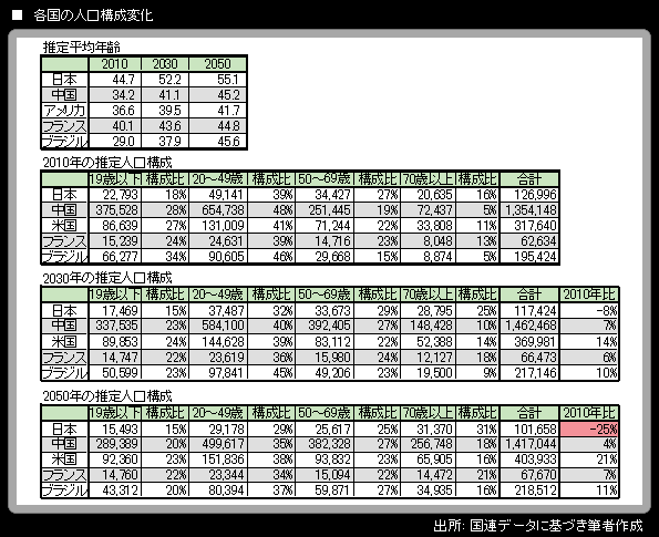 肝心な政策議論の際の報道にはすっぽり抜け落ちているため、国連が作成している国別人口見通しを加工した上で表に示した。「最終需要=消費」という観点から、家計のフローが最も大きな20~49歳の層を意識している。幾つかの注目点を抽出してみよう。