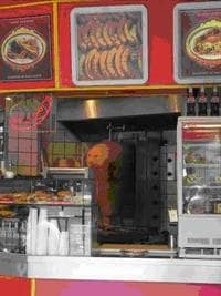 SUSHIより頻繁に目にするのは「ドネルケバブ」です。日本でも目にすることが増えましたが、元来はトルコの伝統的な料理、ミンチや層状に重ねた肉を串に刺して巨大な塊とし、回りからぐるぐると焼いて刀で薄切りにして供します。
