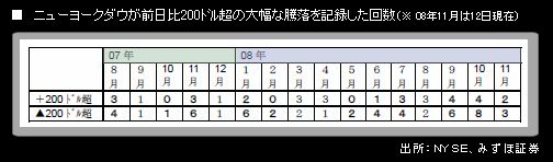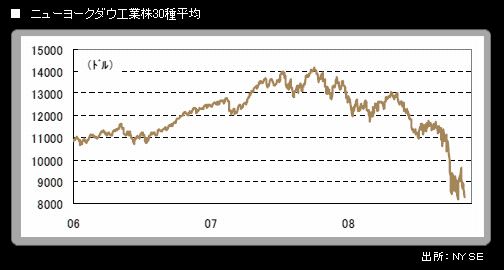 12日の米株式市場で、ニューヨークダウ工業株30種平均は3日続落。下げ幅は前日比▲411.30ドルと大きく、終値は8282.66ドル。10月27日に記録した終値ベースの直近安値8175.77ドルを割り込むのは時間の問題という様相になった。