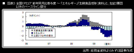 11月27日に総務省から発表された10月の全国消費者物価指数(CPI)は、「生鮮食品を除く総合」ベースの数字(コア)が前年同月比▲2.2%となった。8カ月連続の下落だが、マイナス幅は8月の▲2.4%をピークに、2カ月連続で縮小した。前年同月比の押し上げに寄与した品目は「ガソリン」「灯油」など。押し下げに寄与した品目は「生鮮食品を除く食料」「都市ガス代」「電気代」「家賃」「外国パック旅行」などである。