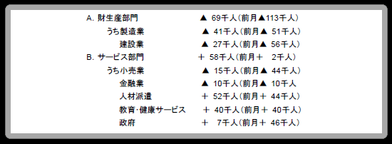 非農業部門雇用者数の、主なカテゴリー別に見た11月の増減は、以下の通りである。特に、人材派遣(temporary help services)は4カ月連続の増加で、プラス幅は前月を上回る大きなものになった。