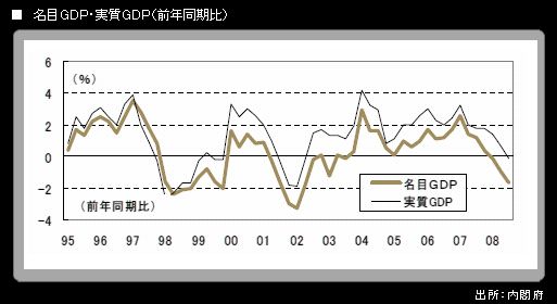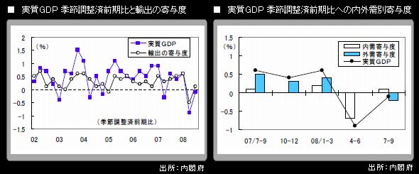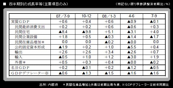 また、実質GDPは前年同期比でも▲0.1%となったが、マイナスになったのは2002年4-6月期以来のことである。景気後退が続いていることは明らかで、市場の関心はその深さ・長さに移行している。
