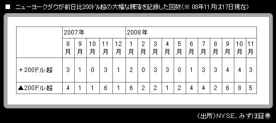 週明け 17日の米株式市場で、ニューヨークダウ工業株30種平均は前日比▲223.73ドル の大幅安。終値は 8273.58ドルとなった。終値ベースの直近ボトムは、10月27日に記録した 8175.77ドル。そこまであと100ドル弱ということになった。筆者は、その水準を割り込んで株安が進むものと予想している。