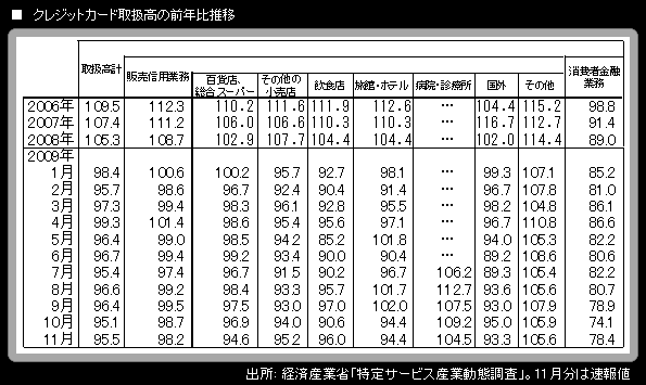 2009年に入ると、公表されている11月速報分までのうち前年同月実績を上回ったのは1月と4月だけ。特に、主力の百貨店・スーパー、その他小売店、飲食店での取扱高は軒並み前年割れが続いている。消費委縮の影響がカードショッピング取扱高にも容赦なく波及した形となっており、半世紀の歴史で初めてのマイナス成長転落が確実な情勢だ。