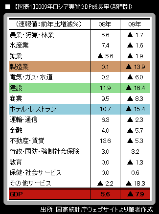 2月1日、ロシア国家統計庁は2009年のGDP(国内総生産)速報値を公表した。それによれば、2009年の同国GDP実質成長率は、前年比でマイナス7.9%となった。