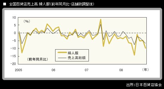 個人消費の動向を探る上で有用な、しかも身近な指標として、筆者は全国百貨店売上高(店舗数調整後=既存店ベース)の内訳である婦人服の動向を注視している。このテーマについては、週刊ダイヤモンド 10月18日号「DATA FOCUS」欄でもコメントした。11月18日に発表された直近10月分で、婦人服は前年同月比▲9.8%となった。2007年7月以降、これで16カ月連続のマイナスを記録。さらに、減少幅は10%近い大きさで、百貨店売上高全体の減少幅(▲6.8%)よりも大きくなっており、いわば「重症」である。