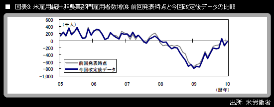 非農業部門雇用者数は、ベンチマーク改定や季節調整替えなどに伴い、2005年1月以降のデータが改定された。事前に予想された通り、過去の雇用者数の水準は、総じて下方にシフトした。