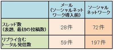 実際のデータで見てみると、メールでの情報共有と比べて、約3倍のコミュニケーション量になった(スレッド単位で2.6倍、それに対するリプライを含めると3.3倍)。発信、参画ともに大幅に増加している(以下の表)。