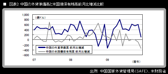 2008年5月頃までは、外貨準備高の前月比増減とほぼ連動させる形で、中国が米国債保有残高を調整しているように見えていた。だが2008年後半には、外貨準備高の月ごとの振れが大きくなる中でも、米国債に対する積極的な投資姿勢を中国は継続した。2008年9月に「リーマン・ショック」が発生し、世界経済が危機的な状況に陥る中で、相対的に安全な米国債に資金を逃避させる姿勢を、中国当局は強めたのだろう。2008年10月に、中国の米国債保有残高が前月比+659億ドルの急増を記録したことが象徴的である。