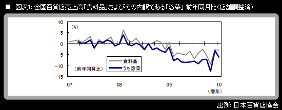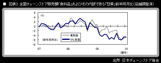 日本チェーンストア協会が22日に発表した1月のチェーンストア(スーパー)販売額(店舗調整済)で、「食料品」は前年同月比▲4.3%(12カ月連続減)、うち「惣菜」は同▲4.9%(14カ月連続減)になった。2009年に入ってから大きく落ち込んでおり、回復の兆しはまだない。
