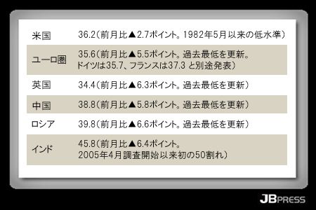 1日に発表された主要国の11月の製造業購買部協会景況指数(PMI;米国はISM指数)の水準を並べてみよう。言うまでもなく、50が好不況の分かれ目であり、30台というのは景気悪化が非常にきつい状態である。
