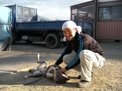 郡山のコメ農家の8代目、藤田浩志さん。農作業の合間に愛犬と憩いのひととき
