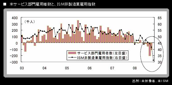 米国では雇用関連指標の大幅悪化が続いており、11月の雇用統計が一段と悪化することは避けられない情勢。特に、ISMの非製造業雇用指数が31.3(前月比▲10.2ポイント)となったことは重い。