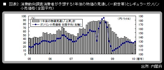 また、消費者が予想する1年後の物価見通し(一般世帯)は、上昇方向に揺り戻している。「低下する」とした回答の合計比率は、政府がデフレ宣言を行った翌月である昨年12月には31.9%に増加していたが、今年1月は27.2%、2月は23.5%と、2カ月連続で減少した。