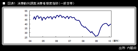 内閣府が3月15日に発表した2月の消費動向調査で、一般世帯の消費者態度指数が39.8(前月比+0.8ポイント)となり、2カ月連続で上昇。指数を構成する4つの意識指標のうち、「暮らし向き」「収入の増え方」「雇用環境」が2カ月連続の上昇。エコポイントなどの政策効果が反映されている「耐久消費財の買い時判断」は3カ月連続の上昇となった。