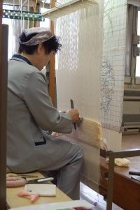 まず原寸大の設計図を用意し、設計図の前に大量の縦糸を垂らす。職人は設計図の指示に沿って、1マス分ずつ縦糸に毛糸を結びつけていく(右の写真)。じゅうたんには毛糸が密集して立っているが、そのすべてを1本ずつ手で刺しているのだ。まさに気の遠くなるような作業である。