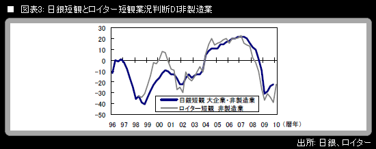 ヘッドラインDIとも呼ばれる大企業・製造業の業況判断DIは、2009年3月調査で▲58まで落ち込んだ後、6月調査で▲48(前期比+10ポイント)、9月調査で▲33(同+15ポイント)、12月調査で▲24(旧ベース;前期比+9ポイント。なお新ベースでは▲25)と、3四半期連続で改善してきた。関連調査の結果からみて、同DIは今回も改善を続けると予想される。