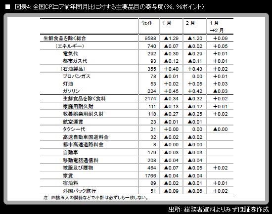 3月26日に総務省が発表した2月の全国消費者物価指数(全国CPI)は、「生鮮食品を除く総合」(コア)が前年同月比▲1.2%になった。マイナス幅は前月から0.1%ポイント縮小したが、12カ月連続の下落である。