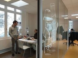 オフィスのガラスには、彼らふたりがモデルになったトレードマークのイラストが描かれている