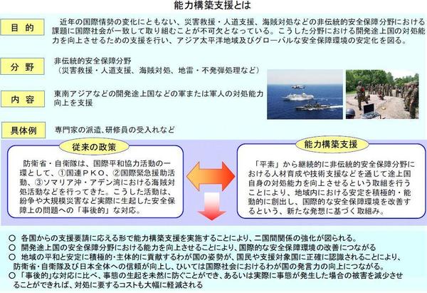 「東南アジアにおける海上安全保障を中心とした非伝統的安全保障分野に係る能力構築支援」という命題は、「東南アジアにおける海上安全保障を中心とした」という限定条件がカギであり、この点を除き防衛省のウェブサイトにある「能力構築支援とは」(次図参照)の中に、その目的、分野、内容及び具体例が示されている。